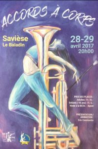 Spectacle Accords à Corps mélangeant musique avec l’Echo du Rawyl d’Ayent et chorégraphie avec les majorettes d’Ayent dans la superbe salle du Baladin à Savièse. Il y aura également deux guitaristes et un violoniste en soliste.